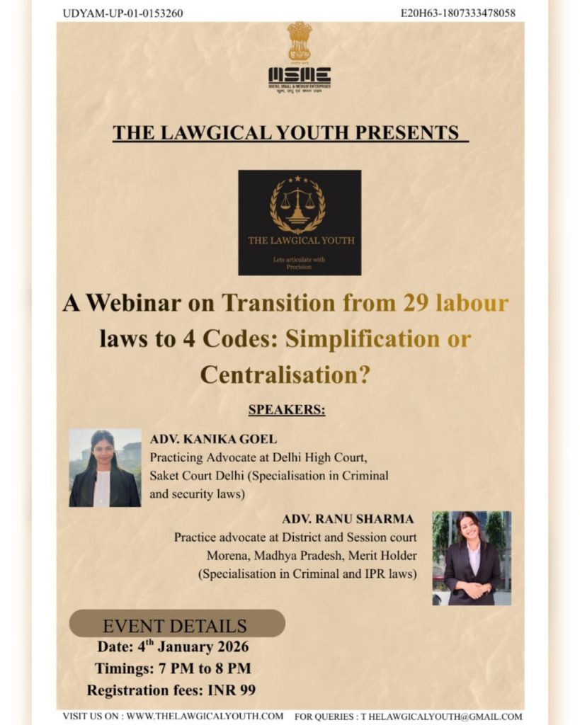 The Lawgical Youth proudly presents an insightful webinar examining one of the most significant reforms in Indian labour jurisprudence โ the transition from 29 labour laws to 4 comprehensive Labour Codes. This session aims to critically analyse whether this reform truly simplifies compliance or leads to greater centralisation of power.
